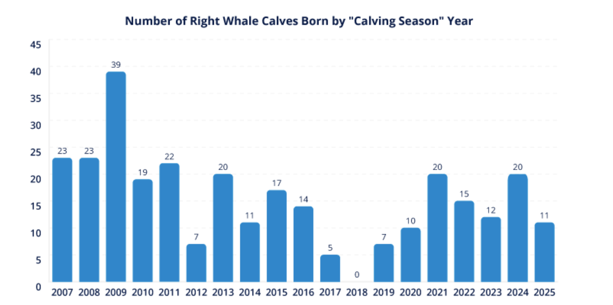 Biologists attribute those lower birth rates to stresses from vessel strike-induced injuries, entanglements, and changes in food availability because of climate change.