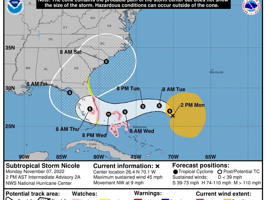 Subtropical Storm Nicole formed Monday east of the northern Bahamas and is forecast to turn west toward the U.S., possibly impacting portions of eastern N.C. this week.
