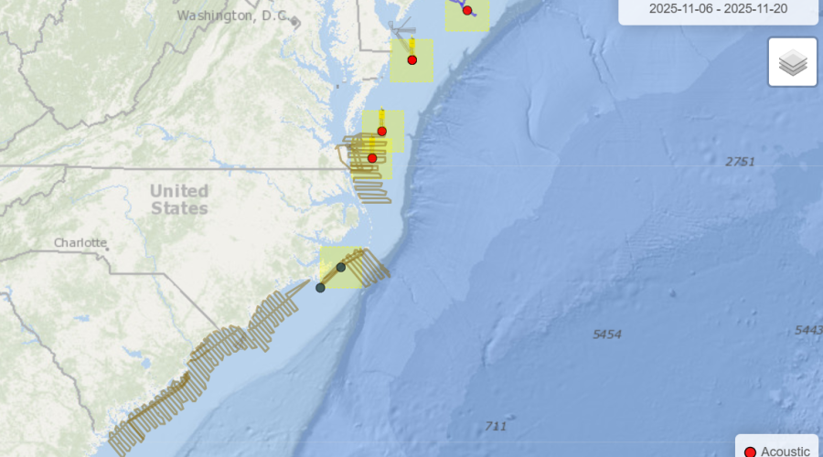 Aerial surveyors spotted four critically endangered North Atlantic right whales off Ocracoke Island, and operators of vessels of all sizes are asked to travel no faster than 10 knots through the area.