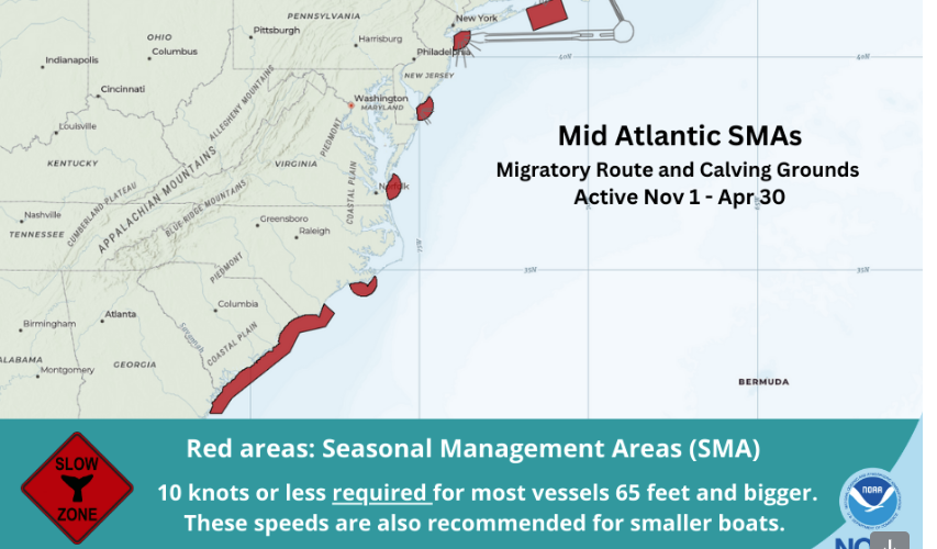 Operators of vessels 65 or longer must maintain speeds of 10 knots or slower through federal seasonal management areas for North Atlantic right whales.