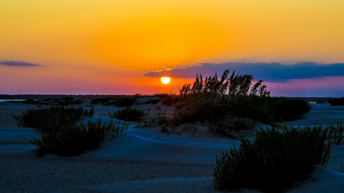 The late-afternoon sunlight casts rich hues over the dunes at Bogue Inlet in Emerald Isle. Photo: Sam Bland