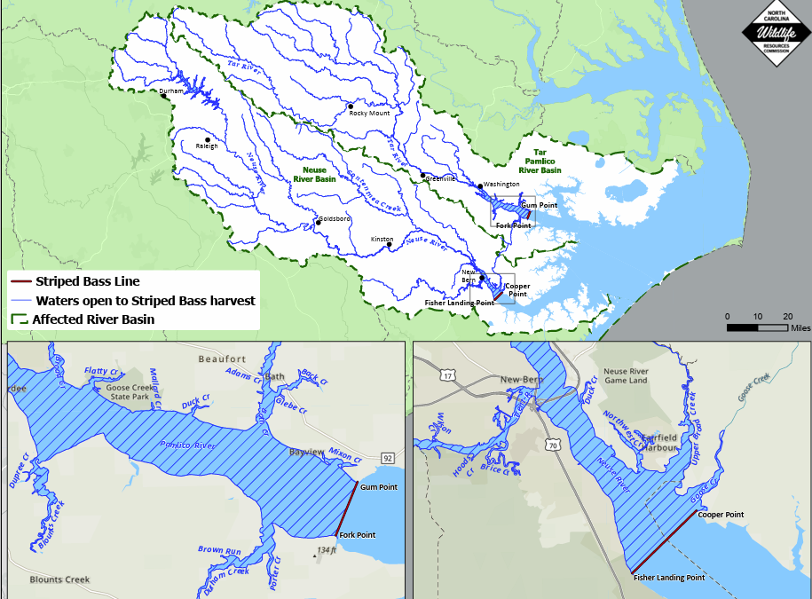 NCDEQ’s Division of Marine Fisheries and North Carolina Wildlife Resources Commission staff have planned an informational meeting for 6 p.m. Nov. 5 in Washington on management changes for striped bass in the Tar-Pamlico and Neuse rivers.